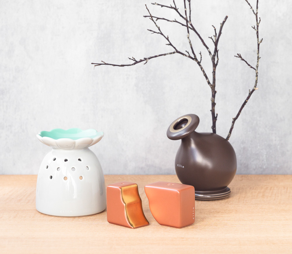 本系列商品共有三件:光彩照人精油燈、幸福的聲音花器、磚之光椒鹽罐。